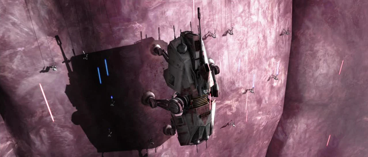 As the Republic forces approach monastery, the OOM commander ordered dwarf spider droids to fire at the gunships. However, the gunships were able to safely land. OOM Commander Droid ordered his battalion of Droid Army to fire at Ahsoka Tano but the AT-TEs fired back. the Jedi and the clone troopers were able to reach the foot of the monastery mesa, taking cover in an overhang. The Jedi and clones used vines to ascend the half-mile cliff, the clone troopers used their grappling hooks in their blaster. While two AT-TE used the claws in their footpads to maintain a strong hold on the vertical face. Many spider droids fired at the both AT-TEs, one AT-TE was destroyed, Ahsoka defended the remaining walker by jumping onto its windscreen and rebounding the droid fire.