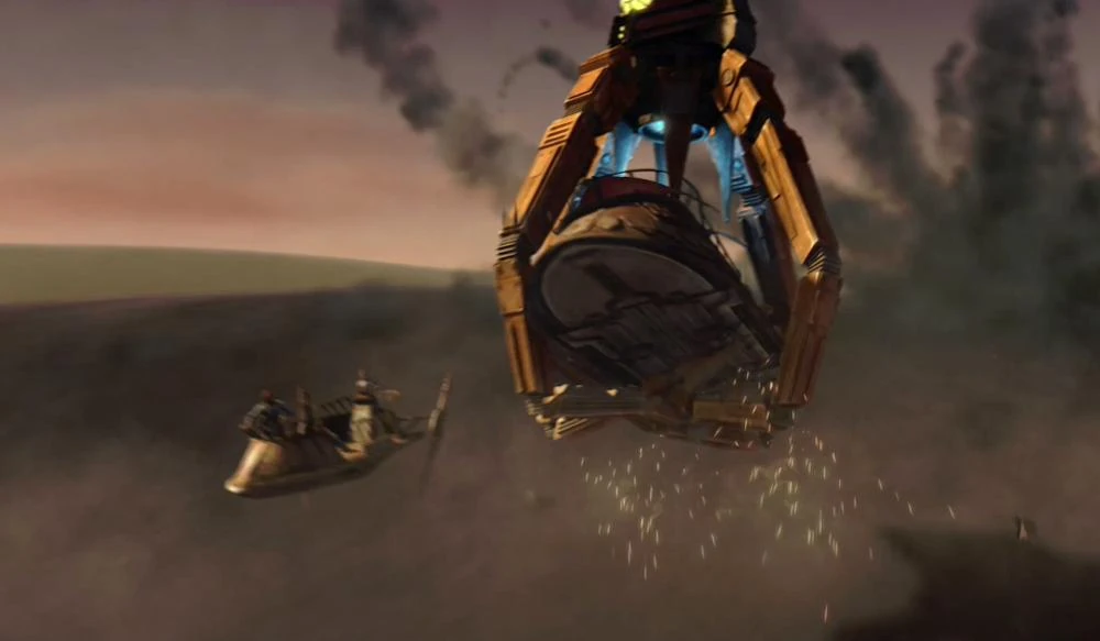 As Ventress pursued the two Jedi, Obi-Wan, true to his word, had arrived with the 212th battalion. Obi-Wan led a squadron of clone troopers into battle against the vulture droids. A Republic gunship hovered near a platform so that the Jedi and Rotta could board. Unfortunately, a vulture droid destroyed the gunship and landed on the platform. Anakin and Ahsoka immediately destroyed it and sent it off the platform before trying to contact Kenobi. However, the droids jammed their signals.
