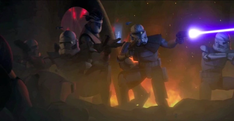 They were attacked by B1 Battle Droids who realized who they were in the hanger and the supply ship's commander ordered the reactor core to be ray shielded and all security systems strengthened. Hardcase then got out of his fighter, detached his fighter's missile launcher, and got to the main generator room. He then ordered Fives and Jesse to get out of the ship. They narrowly escaped before the supply ship exploded, resulting Hardcase's death.