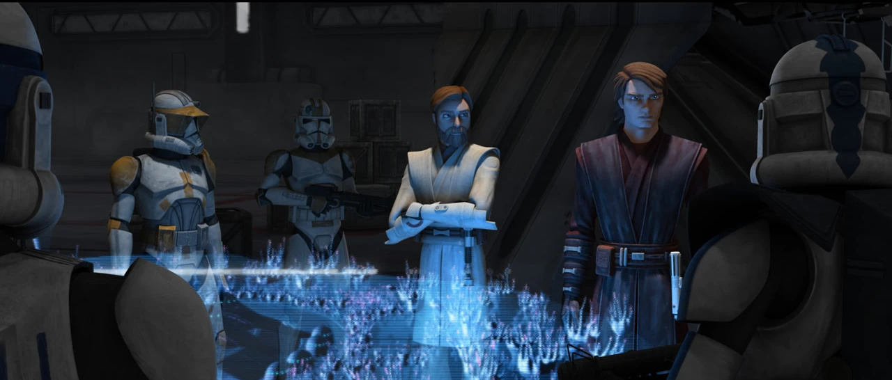 through the enemy defenses and the two decided to launch a heavily armed gunship attack force. R2-D2 showed the holographic map of Umbara's surface while Kenobi explained the plan. Masters Tiin, Krell and Kenobi would attack the Umbaran forces from south while Anakin's battalion would move in from the north and destroy the enemy reinforcements. Obi-Wan then explained the importance of taking over the capital city, while Anakin warned his troops about the local militia. Kenobi advised Skywalker to remember the importance of his battalion's success knowing that if the local militia wasn't defeated the capital would never surrender.
