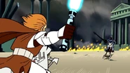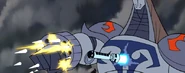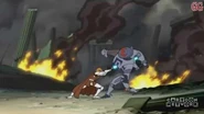 Due to his being a Gen'Dai, Durge easily survives the stabbing, and proceeds to laugh and beat Kenobi with his fists. Kenobi, with his saber still lodged in Durge's chest, can't retaliate, and is lifted bodily off the ground by a solid punch in the gut. Durge proceeds to fire at Kenobi with a small rapid projectile launcher, but the Jedi deflects the slugs with the Force. Switching to a flame thrower, Durge's attacks are again deflected and Kenobi crushes the flame thrower with the Force. Brandishing a massive flail, Durge attempts to finish off Kenobi, but Kenobi uses the Force to summon his lightsaber and severs the flails chain. Brandishing his two blaster pistols, Durge is disarmed before he can use them. Switching on energy shields in his gauntlets, he deflects Kenobi's lightsaber slashes, but is unable to adequately counter-attack. Kenobi presses his advantage, with Durge barely blocking, until finally, Kenobi slices off Durge's arm and bisects him through the middle. After seemingly defeating Durge, he proceeds to join the ARC troopers. Captain Fordo reports that his troopers are in position. Taking off on his speeder bike, he leaves Durge's remains, which, unknown to the Jedi, begin to rejoin and heal themselves.