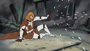 As they fight, Durge deprives Kenobi of his lance, so Kenobi brandishes his lightsaber and destroys Durge's swoop bike with it. The swoop explodes, but the bounty hunter walks unharmed from the inferno. Kenobi charges in to skewer Durge, but in a display of speed, strength and coordination, the bounty hunter catches Kenobi's swoop by the steering vanes and flips the Jedi off. Durge then charges Kenobi, wielding the swoop as a club, but Kenobi slices it to pieces and stabs Durge through the chest.