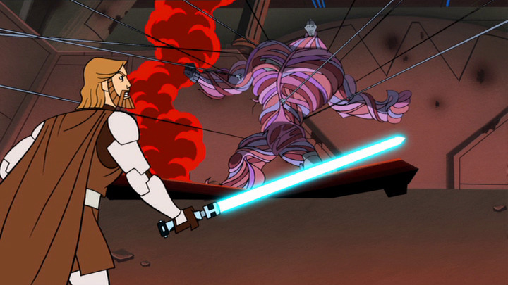 The blaster fire has no effect, and Durge simply rips the lines from the wall with his sheer strength, toppling the clones. Charging at Kenobi, Durge goes over Obi-Wan and uses his body`s tentacles to absorve him into his body. The ARC Captain, Fordo, fires a wire at Durge and pumps electricity through it, hoping to fry Durge. This only succeeds in enraging the Gen'Dai, who charges Fordo.