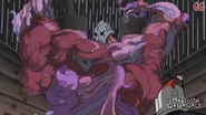 Thinking Durge to be dead, the troopers approach the smoking crater they had made, only to be knocked aside by a massive fleshy arm seemingly made of pure muscle tendons. Durge climbs from the crater. All his armor and gloves, except his helmet, blasted off, revealing his true Gen'Dai form. He quickly attacks Kenobi, driving the Jedi atop the situation table, which Durge snaps in half with his fists. Suddenly, all the clones in the room launch grappling hooks at Durge, hoping to restrain him while they blast him.