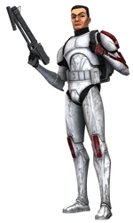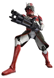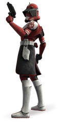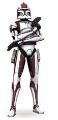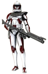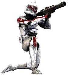The members of the Coruscant Guard wore white armor with crimson and red markings, just like shock troopers. Some also had crimson Galactic Senate markings on them. They all were equipped with the standard DC-15A blaster rifle, and all the clone riot troopers had batons and shields.