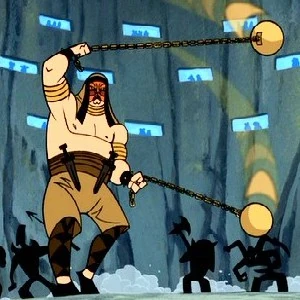 Flalios was the only Human gladiator in the Cauldron on Rattatak, where he used twin ball-and-chain weapons against other fighters like Swyy'm-Ee and Asajj Ventress. Flalios was defeated and killed by Asajj Ventress.