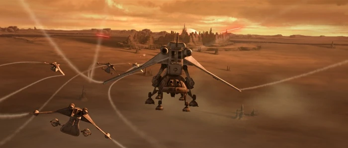 Skywalker, Tano, and Rex had crashed land away from the landing zone, and had no air support to help them since the fighters were too busy fighting in the air. Skywalker insisted the group to keep going, and the group fought the Geonosians. Tano asked if Obi-Wan had made it to the landing zone, and Skywalker wasn't sure. He contacted Admiral Yularen for air support, but the admiral could not do anything.