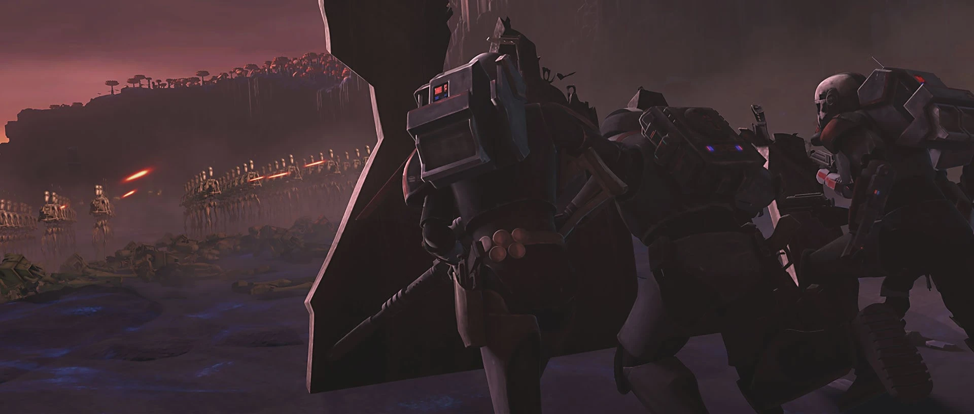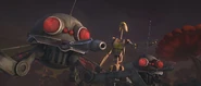 Their crash site is soon discovered by a large force of Droids, but Hunter and the Bad Batch insist on taking them head-on. Rex and Jesse watch in astonishment as the Bad Batch single-handedly dispatch the entire force with their unconventional tactics. Having cleared a path, they lead the group on towards the cyber station. Kix soon evacuates Cody from the field, leaving Rex in command of the mission, about which the Bad Batch have doubts. Hunter nonetheless pulls them together and agrees to let Rex lead them.