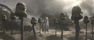 Years later, an Imperial Shuttle lands near the crash site with a contingent of Stormtroopers. Darth Vader emerges and walks towards the cruiser. Coming to the clone gravesite, he digs Ahsoka's lightsaber out of the snow and activates it. He looks at the blade, then up at a convor circling overhead, for a long moment. Vader then deactivates the saber and walks away, reflected in the cracked visor of a clone trooper helmet belonging to Ahsoka's company.