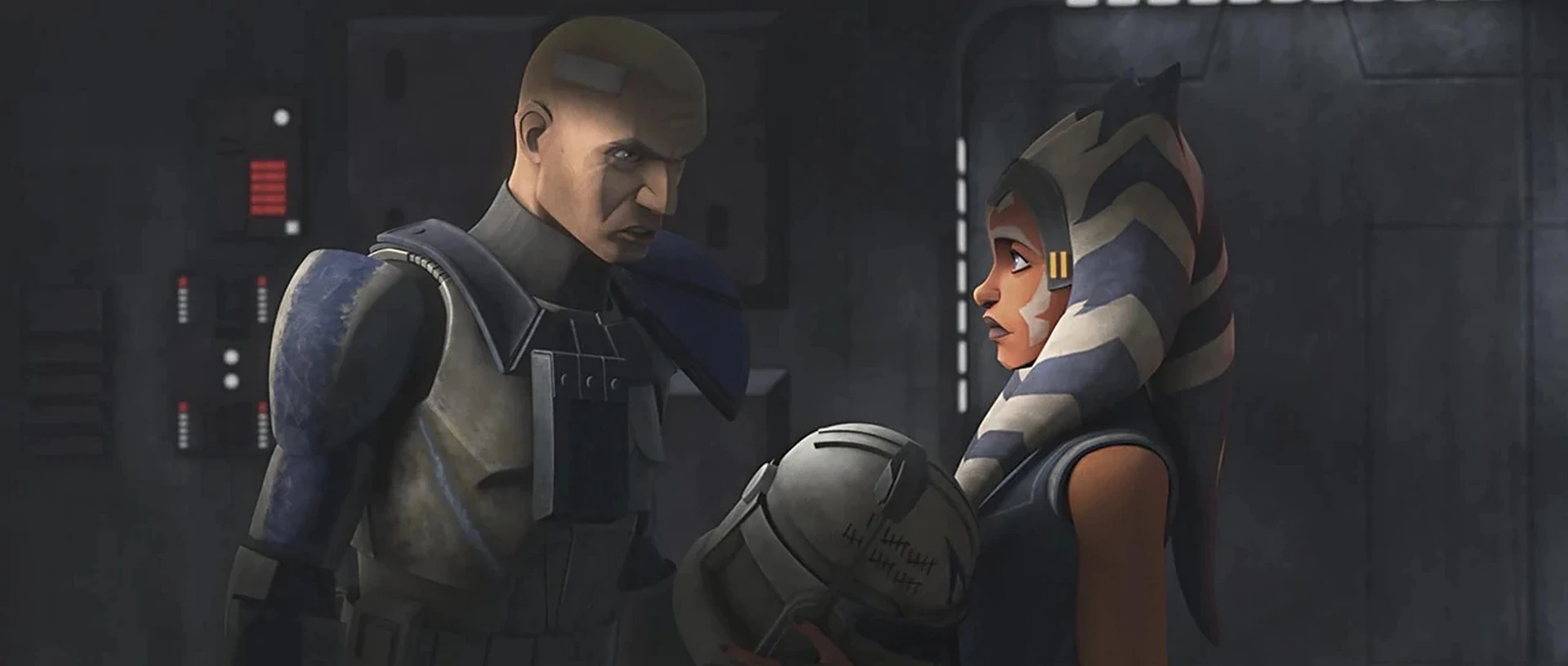 Ahsoka weighs their options; Rex says that they will need to fight their way out, but Ahsoka is unwilling to kill the men who she served with for so long. Rex tells her that they won't share her sentiment, that they are willing to die if it means taking her with them. She removes his helmet, seeing the tears in his eyes. She affirms him that he is a good soldier, as are the men down below, but she will not be the one to kill them. Instead, she forms an idea.