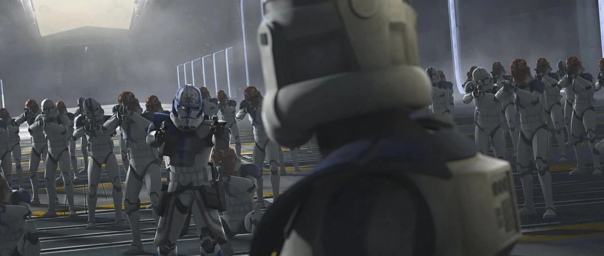 Jesse receives a report that Maul is headed for the main hangar, but right then, Rex emerges onto the hangar deck with Ahsoka as his captive. The droids sneak by off to the side and plug into a terminal. Jesse demands that Tano be executed immediately, but Rex belays the order: he explains that Ahsoka is exempt from Order 66 as she is no longer a member of the Jedi Order. But Jesse reminds him that Darth Sidious himself ordered Tano's death and they must comply. Ahsoka tells Rex to keep them talking a little longer. Rex tries to convince Jesse to trust him after all they've been through, lest they all be subject to treason. Jesse responds by charging Rex with treason and ordering his execution alongside the traitor, Ahsoka Tano. By then, the droids successfully sliced the hangar controls. Ahsoka seizes her lightsabers and signals them to drop the maintenance platforms.