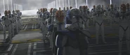 Ahsoka, Rex, and the droids fight their way into the main hangar control room, finding that all hangar bays are secured. Rex notes that he would be proud of his men, were they not trying to kill them. While R7 unlocks the hangar blast doors, Ahsoka orders Cheep to prep the shuttle while G-G slices into the main computer. G-G reports that the hyperdrive is offline. Ahsoka has R7 open the main hangar doors, revealing that their cruiser is caught in the moon's gravity. R7 then unlocks the doors containing a Nu-class shuttle, but a full platoon of clone troopers also emerges, led by Jesse, who secure the hangar to cut off Tano's escape.